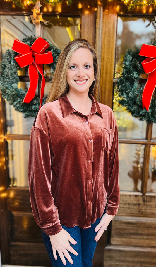 Rose gold velvet button up top