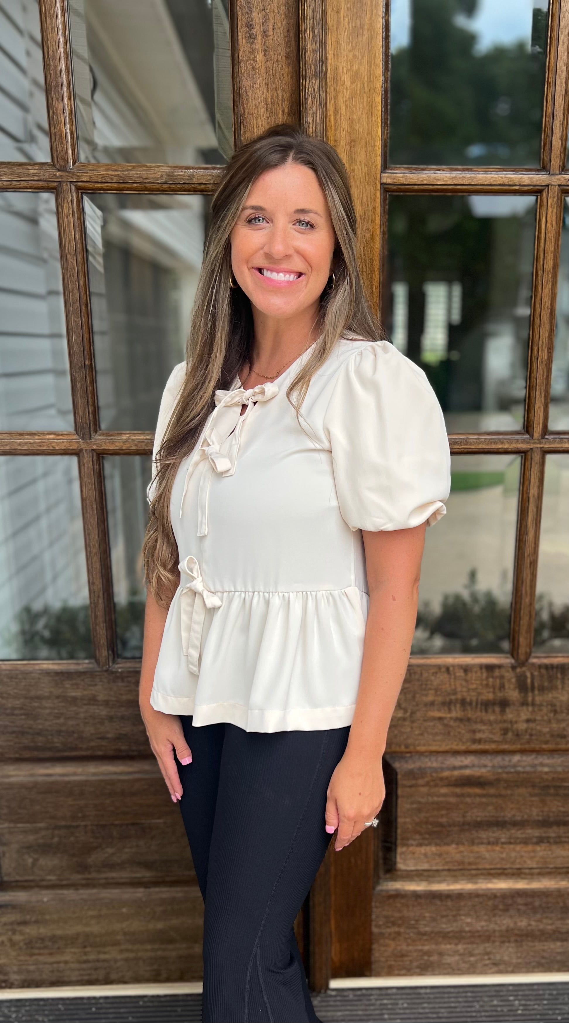 Elevate your dress casual look with our Cream Colored Bow Tie Ruffle blouse. Featuring light fabric and a delicate ruffle, the puff sleeves and bow tie ribbons up the front add an elegant touch. Perfect for any occasion, this piece exudes effortless style. Fits true to size.