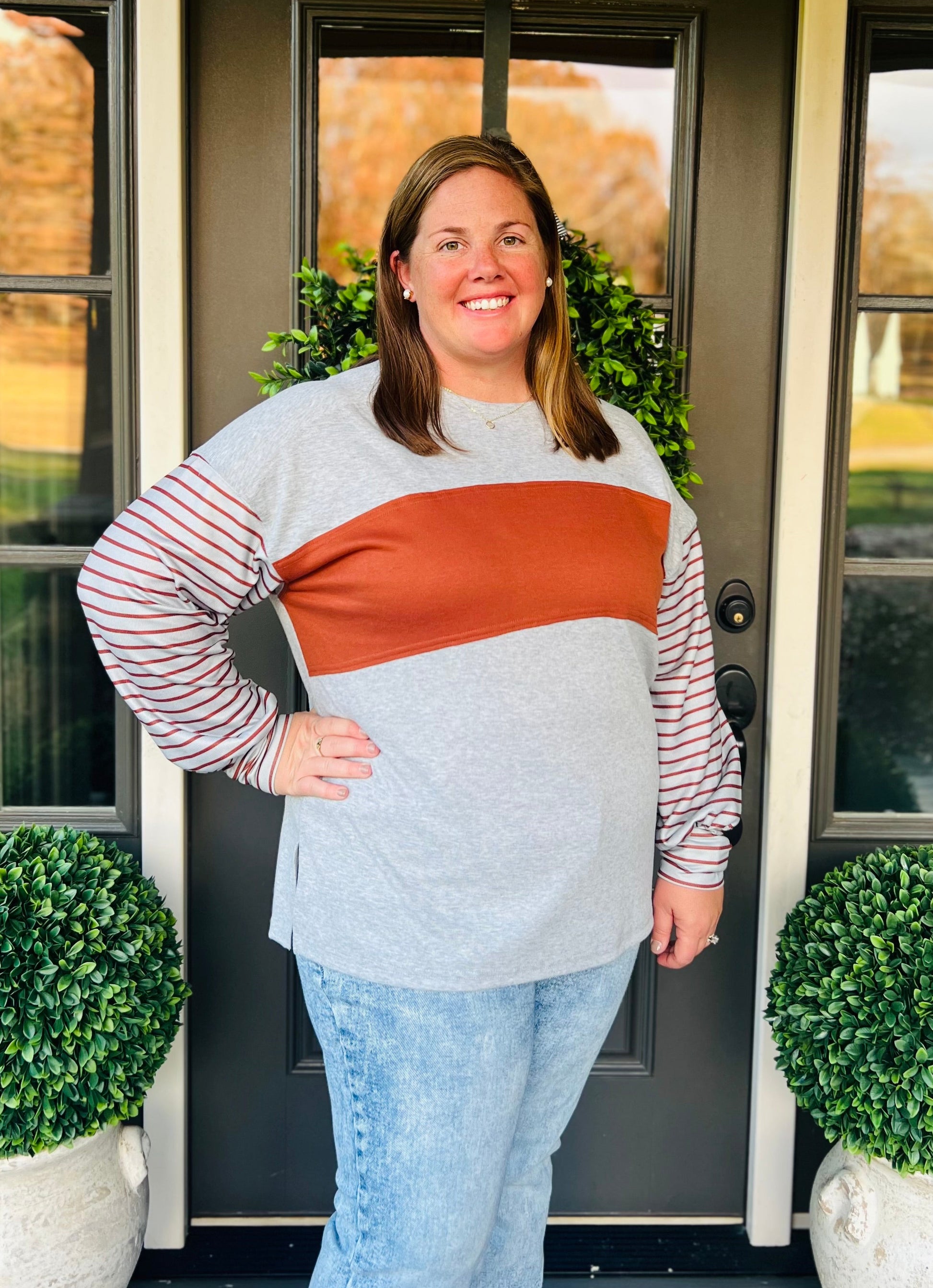 This color block drop shoulder pullover features a charming combination of gray and rusty orange. The addition of orange striped sleeves and side slits adds both style and comfort to this top. Additionally, it has a true-to-size fit.