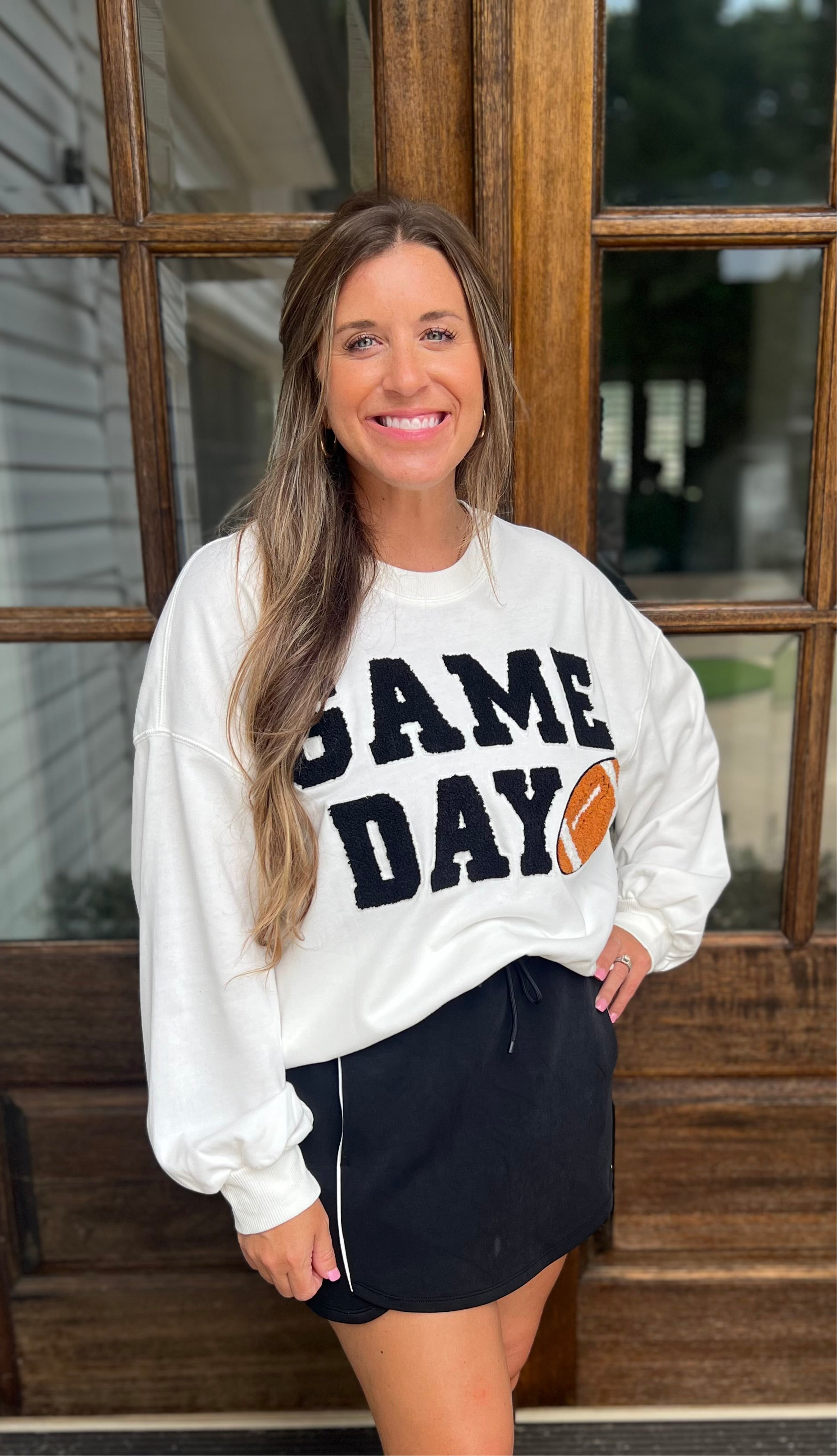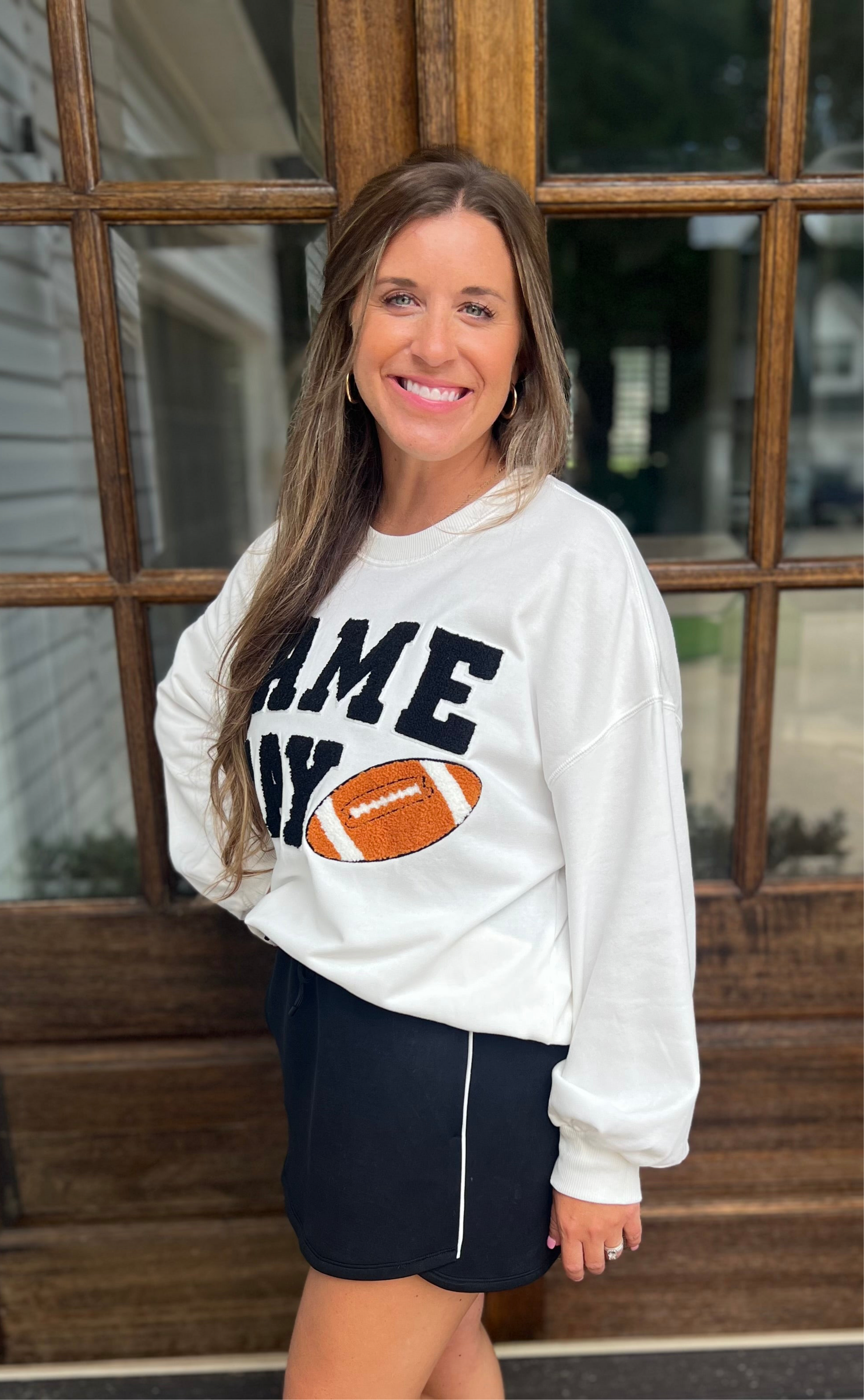 Unleash your team spirit with our Game Day Football Sweatshirt! This white, loose-fitted sweatshirt proudly displays bold "GAME DAY" letters, perfect for any football fan. With a varsity style and true-to-size fit, this sweatshirt is a must-have for game day.