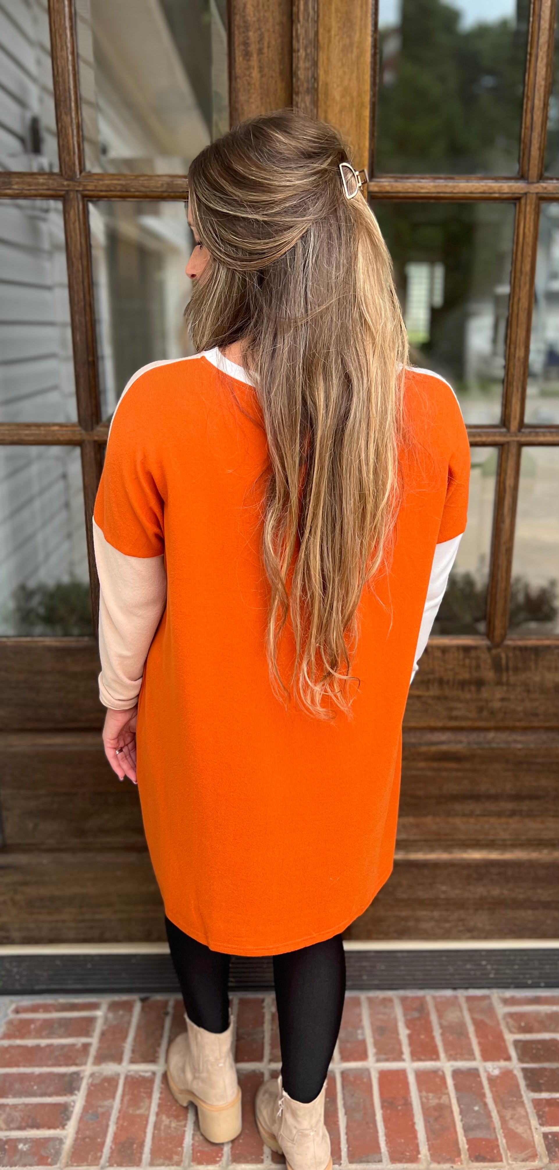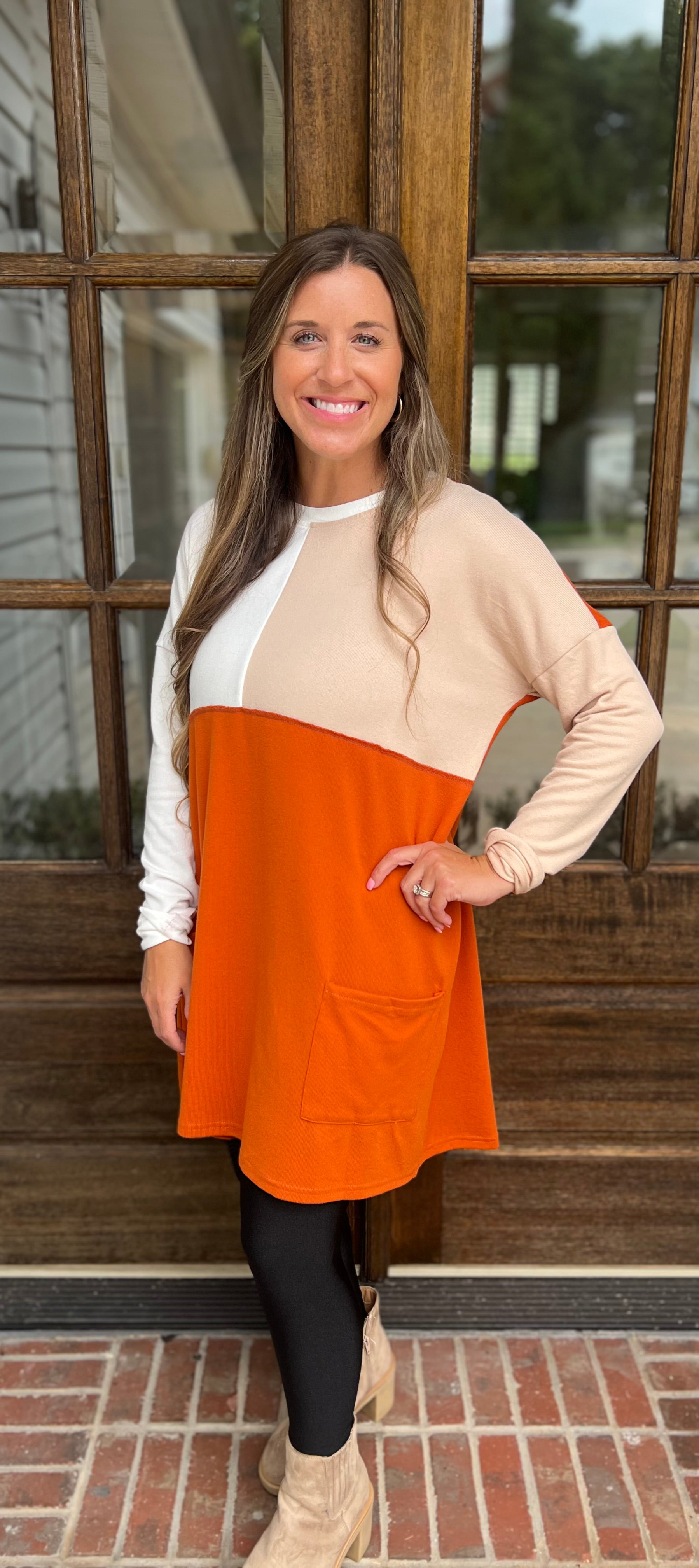 Discover the perfect blend of fashion and comfort with our Pocketed Color Block Long Sleeve Top. Featuring gorgeous fall colors and an oversized design, this top can be worn as a dress or top, paired with our June leggings for a casual yet stylish look. Elevate your wardrobe today! Fits true to size. Model is 4’ 11” tall.