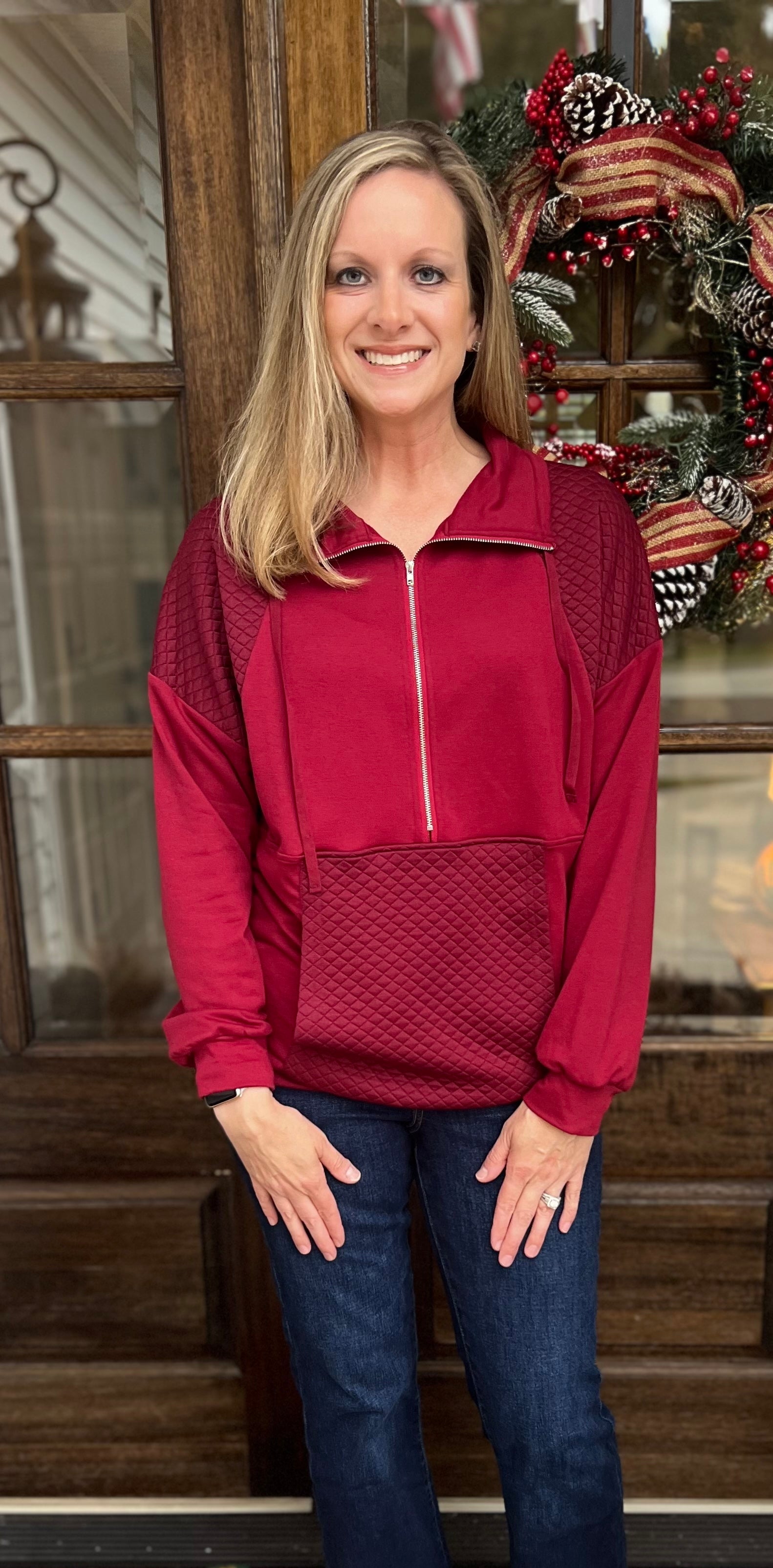 This beautiful red pullover is a soft material with an option to wear a shirt underneath. The length of the top and the way it is made offers a versatile look to wear with jeans or leggings. The quilted material offers a more sophisticated look while still remaining casual.