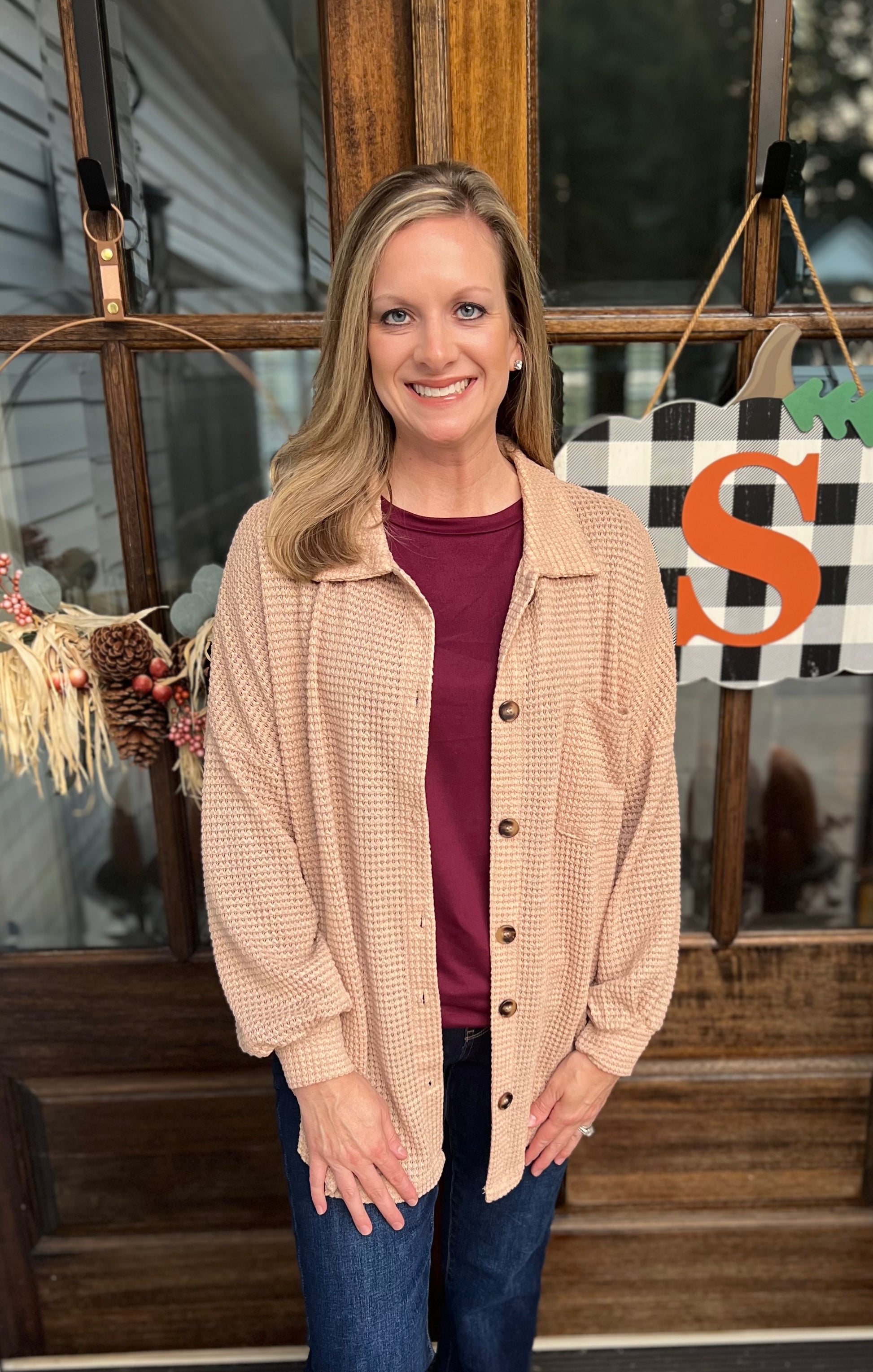 This waffle knit button up is an essential addition to your wardrobe. Its thin knit design makes it a versatile piece that can be worn as a light jacket. Perfectly pair it with jeans or leggings and layer over a tee or a more formal top.